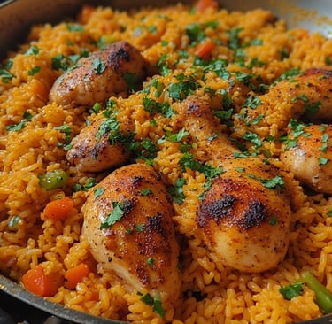 "Arroz con Pollo" literally means “Rice with Chicken.” It’s the ultimate comfort food in many Latin American and Spanish homes. Each region has its twist, but the basics remain the same: juicy pieces of chicken and flavorful rice cooked in one pan, with onions, tomatoes, peppers, and aromatic seasonings. It’s a meal that feels both cozy and festive, making it perfect for any occasion. This recipe is a simple and delicious introduction to Arroz con Pollo, with easy-to-find ingredients and clear steps suitable for beginners!
